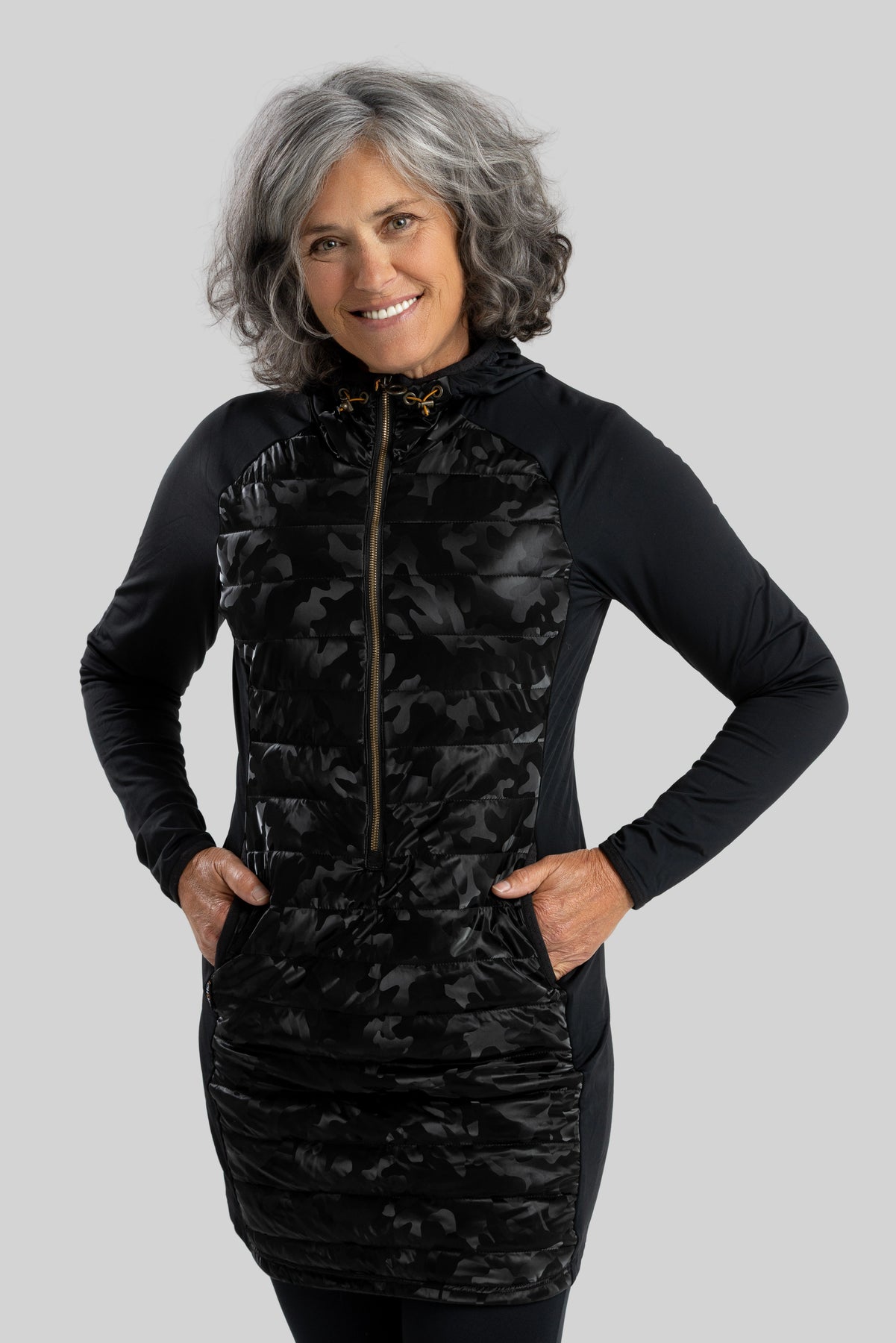 Meet our versatile Kangaroo Top — a true wardrobe essential that doubles as a dress. Layer it effortlessly over a sweater and leggings for a chic, cozy look, even on the coldest winter days. Lightweight quilted fabric provides warmth without bulk, while the stretch panels at the back and along the sleeves allow full freedom of movement, so you can stay active and comfortable all day long. Perfect for city strolls, outdoor adventures, or simply lounging in style, this piece combines practicality with modern, effortless appeal.